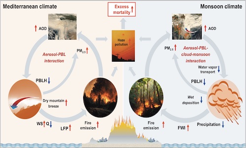57365线路检测中心2009届本科毕业校友黄昕教授及其团队最新研究发现,作为全球重要自然灾害的野火不仅受气象条件影响,而且其所排放气溶胶的辐射效应也可改变气象要素,由此产生天气尺度的正反馈机制显著增强全球不同沿海地区的极端野火事件。近日,论文“Smoke-weather interaction affects extreme wildfires in diverse coastal regions”以Research Article形式发表于《Science》杂志,并被作为同期亮点成果(Science, 379, 6631, 457-461 (2023), 论文链接:https://doi.org/10.1126/science.add9843)。该论文由我院2009届本科毕业校友黄昕教授作为联合第一作者和共同通讯作者。