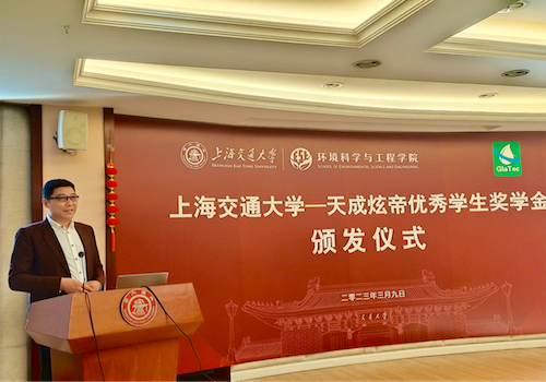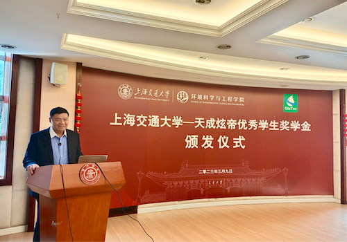 滕国忠致辞表示,上海天成环境保护有限公司是集环保工程技术研究、开发、设计、施工至环保设施运营为一体的综合型专业性公司,一直以来和周教授团队保持着良好的合作。此次用奖学金的方式支持环境学院优秀学子的学习和科研工作,正体现了企业的初心和使命,后续会持续设立奖学金激励更多学生。