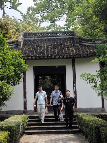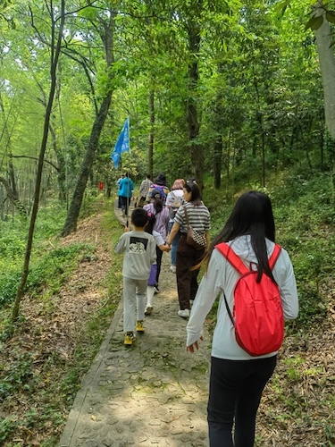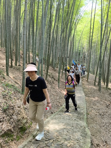 进入天马山景区后,会员们沿着游览图一路寻去,看剑亭、三高士墓、八仙坡、留云壁、濯月泉、卧松亭等让老师们不知不觉走入梦幻的江湖风云中。其中,大家印象最深的当属护珠塔。七级八面的护珠塔始建于南宋绍兴二十七年(1157年),由招抚使周文达出资建塔。岁月变迁,磅礴的寺庙如今只剩下这一处痕迹。千年以来,由于地基变动,塔身逐渐朝东南方向倾斜,截至2015年,护珠塔向东偏离2.28米,倾斜度7.10°。由于其斜度已超过了著名的意大利比萨斜塔,故有“上海比萨斜塔”之称,成为上海一大经典奇观。