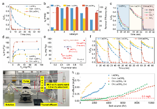 OA-La(OH)3展现出优异的深度除磷性能和循环性。初始磷浓度为1 mg/L条件下,5分钟内OA-La(OH)3实现完全吸附除磷,最大饱和吸附量高达168 mg P/g,远优于未修饰的La(OH)3(47.9%, 105 mg P/g)和商业La(OH)3(7.9%, 66.2 mg P/g)。该材料还展现出优异的选择性和循环性,经过5次循环仍能完全吸附除磷。在连续流装置中,OA-La(OH)3可以有效处理~5000床体积的模拟废水和~3700床体积的实际废水至水框架指令标准以下(0.1 mg/L)。