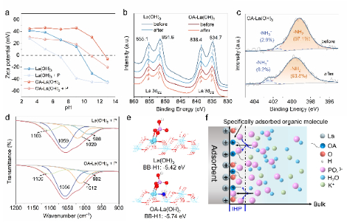 N 1s XPS表明OA-La(OH)3表面的氨基在水溶液中易于质子化为NH3+,同时以磷酸根(H2PO4-和HPO42-)作为拉曼探测pH的信号分子,证明了OA-La(OH)3表面的微碱性环境和氨基在水溶液中质子化。Zeta电位结果也表明OA-La(OH)3含有更高的等电点和更多的正电荷。该电正性的OA-La(OH)3有利于定向富集低浓度电负性磷酸根离子,加速磷酸根离子向吸附剂表面迁移和固定,打破低浓度磷酸根传质壁垒。
