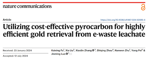 近日,学院罗金明副教授在国际权威学术刊物《自然·通讯》(Nature Communications)上,发表了题为“Utilizing cost-effective pyrocarbon for highly efficient gold retrieval from e-waste leachate”的重要研究成果。