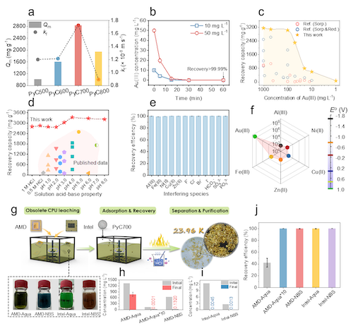 热解碳表现出高回收能力、优异选择性和广泛适用性,特别是在实际CPU浸出液中能高效回收高纯度黄金(>99.82%,23.96K)。技术经济分析进一步证实,基于热解碳的黄金回收工艺展现了显著的经济效益,投入产出比高达1370%。