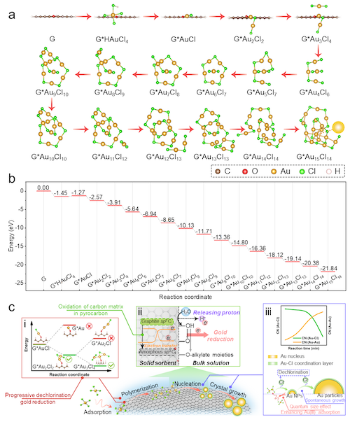 图3、图4分别为热解碳吸附剂回收黄金机理的表征和理论计算结果。热解碳表面的芳香结构提供了关键的电子源,通过水中羟基化过程同时生成电子和酚羟基,用于还原金离子。XPS和FTIR分析显示,金吸附过程中,热解碳的石墨化碳结构发生氧化,石墨化结构中的sp2-杂化碳转变为sp3-杂化碳。实验和理论计算揭示了水分子在热解碳表面解离为羟基离子和质子,羟基离子诱导芳香结构羟基化,生成更多的酚羟基并提供电子用于高价金的还原。DFT计算表明,氯络合态的金离子通过逐步脱氯反应形成金-氯中间体,这一团簇状中间体随后逐步还原生成金核,降低了整个还原过程的反应能垒。